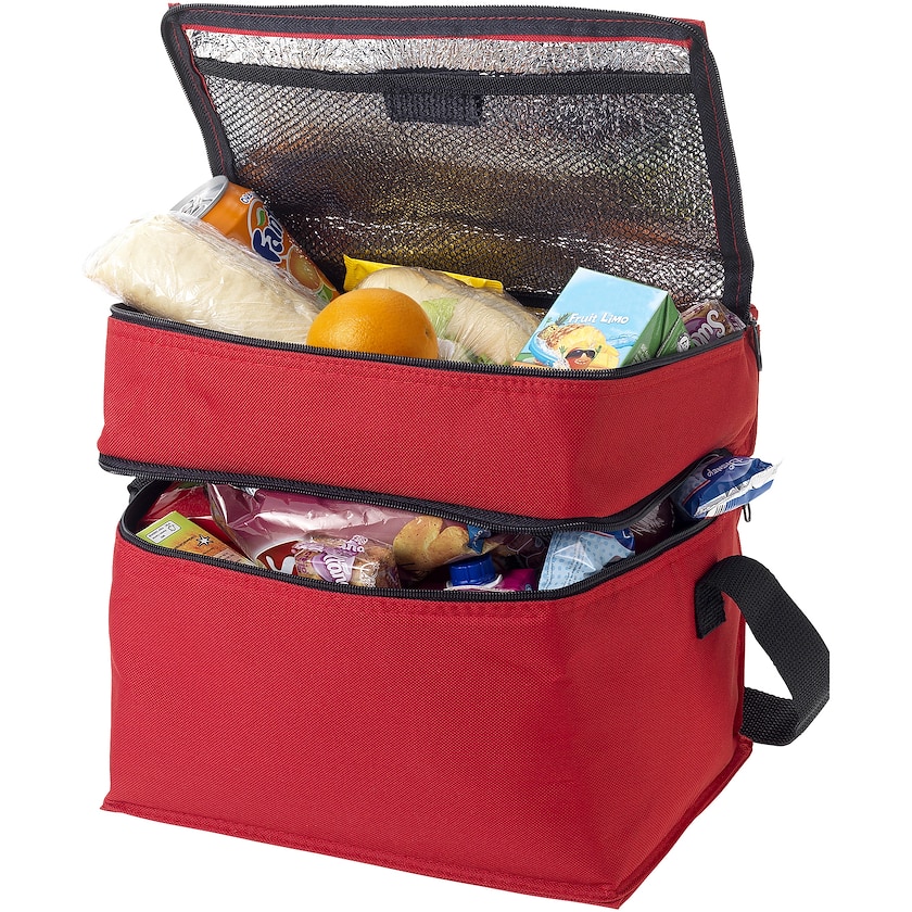Käytännöllinen kylmälaukku olkahihnalla sekä kahdella suurella taskulla varustettuna. Ylempi lokero sopii mainiosti pienille välipaloille ja muille viilennetyille eväille, kun taas alempi on ihanteellinen isoille kylmässä pidettäville eväille. Olkahihna on säädettävissä.