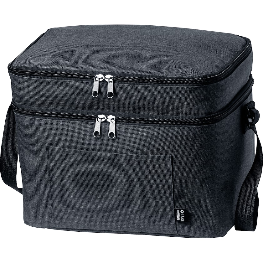 Tilava kylmälaukku, jossa on kierrätysmateriaalista valmistettu kangas. Kylmälaukussa on kaksi vetoketjullista säilytyslokeroa ja säädettävä olkahihna.