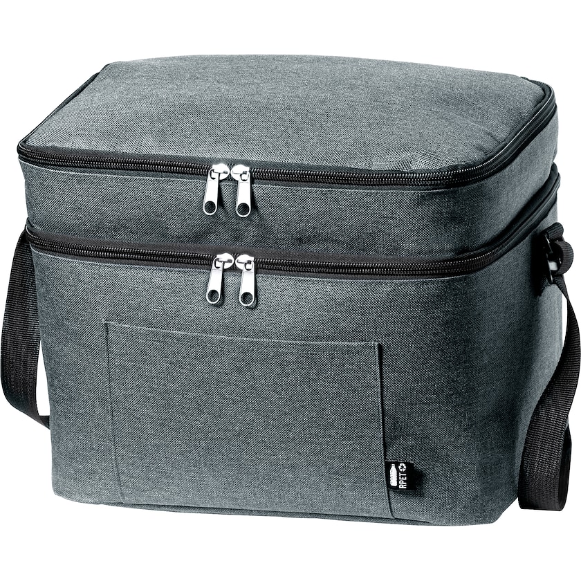 Tilava kylmälaukku, jossa on kierrätysmateriaalista valmistettu kangas. Kylmälaukussa on kaksi vetoketjullista säilytyslokeroa ja säädettävä olkahihna.