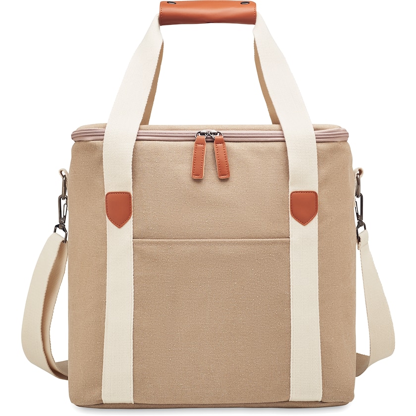 Suuri kanvaasikankaasta tehty kylmälaukku puuvillaremmeillä. Voidaan kantaa sekä olkapäällä että kädessä. Ylellinen kylmälaukku isolle piknikille!
