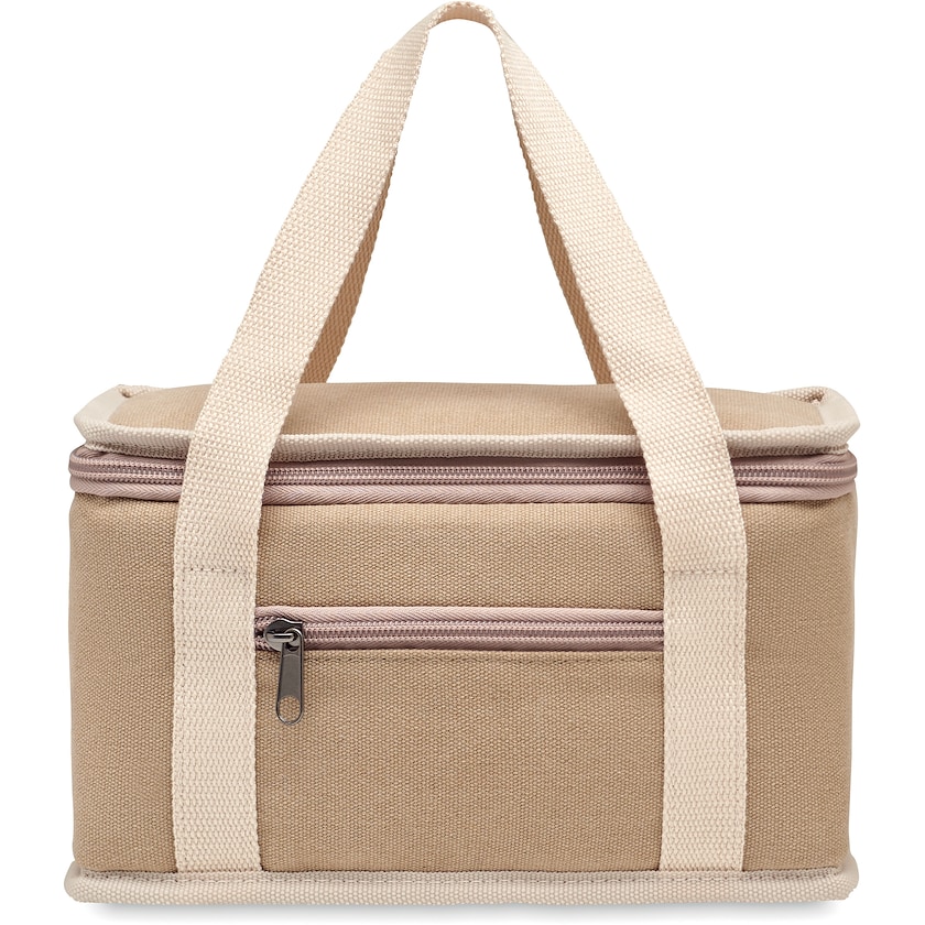Kylmälaukku canvaskankaalla ja puuvillakahvoilla. Edessä on vetoketjullinen tasku.