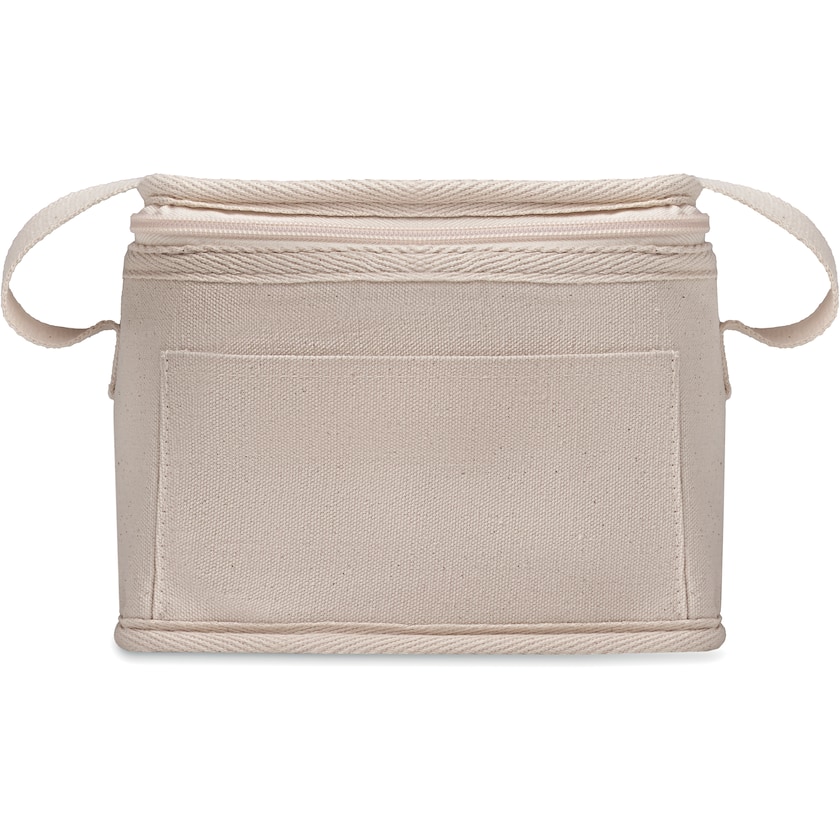 Kylmälaukku vahvasta luonnonvärisestä puuvillakankaasta. Edessä on pieni säilytystasku. Kylmälaukkua kannetaan kädessä.
