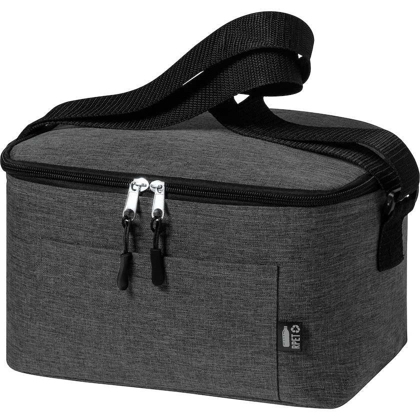 Kylmälaukku ympäristöystävällisestä materiaalista. Kassin ulkopuoli on rPETiä, joka on tehty PET-muovipulloista. Laukun sisäpuoli on alumiinia. Sivuetiketti osoittaa laukun materiaalin olevan rPETiä.
