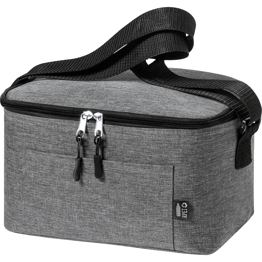 Kylmälaukku ympäristöystävällisestä materiaalista. Kassin ulkopuoli on rPETiä, joka on tehty PET-muovipulloista. Laukun sisäpuoli on alumiinia. Sivuetiketti osoittaa laukun materiaalin olevan rPETiä.