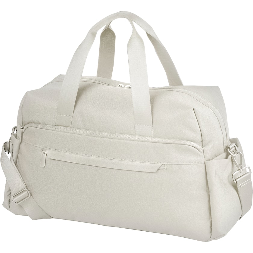 Minimalistisesti suunniteltu laadukas viikonloppulaukku. Edessä on vetoketjullinen tasku pienempiä tavaroita varten. Sisällä kolme pienempää taskua arvoesineille. Olkahihnat ovat irrotettavissa. Kangas on valmistettu kierrätetystä 600D polyesterista.