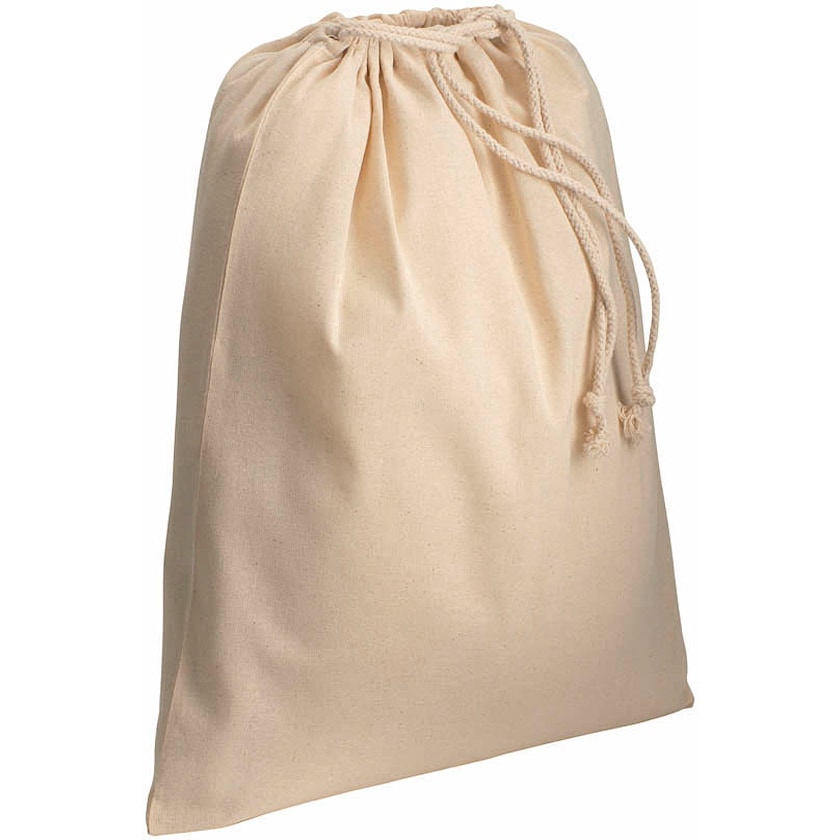 Suuri pussi 120 gramman puuvillakankaasta. Luonnonvaalea pussi suljetaan yläosan narujen avulla.