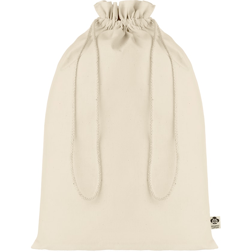 Suuri lahjapussi luomuviljellystä puuvillasta. Pussi on valmistettu 105 gramman luonnonvaaleasta kankaasta. Pussin sivusaumassa on luomupuuvillasta kertova etiketti.