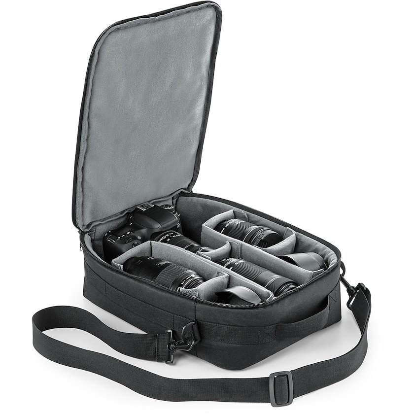 Kameralaukku, joka sisältää useita lokeroita kameralle ja objektiiveille. Lokeroiden kokoa voi muokata tarrakiinnitteisten seinien avulla. Laukku on pehmustettu, joten se suojaa kameran osia kolhuilta. Laukun olkahihna on säädettävä ja irroitettava.