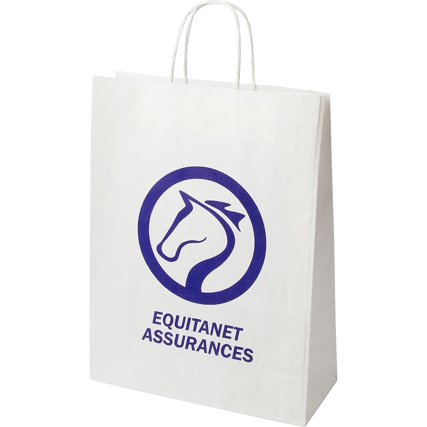 Paperikassi kierrenarukahvoilla ja omalla painatuksella. Sileäpintaisen kassin kantokyky on 15 kg. Painatuksen hinta sisältää yksipuolisen painatuksen.