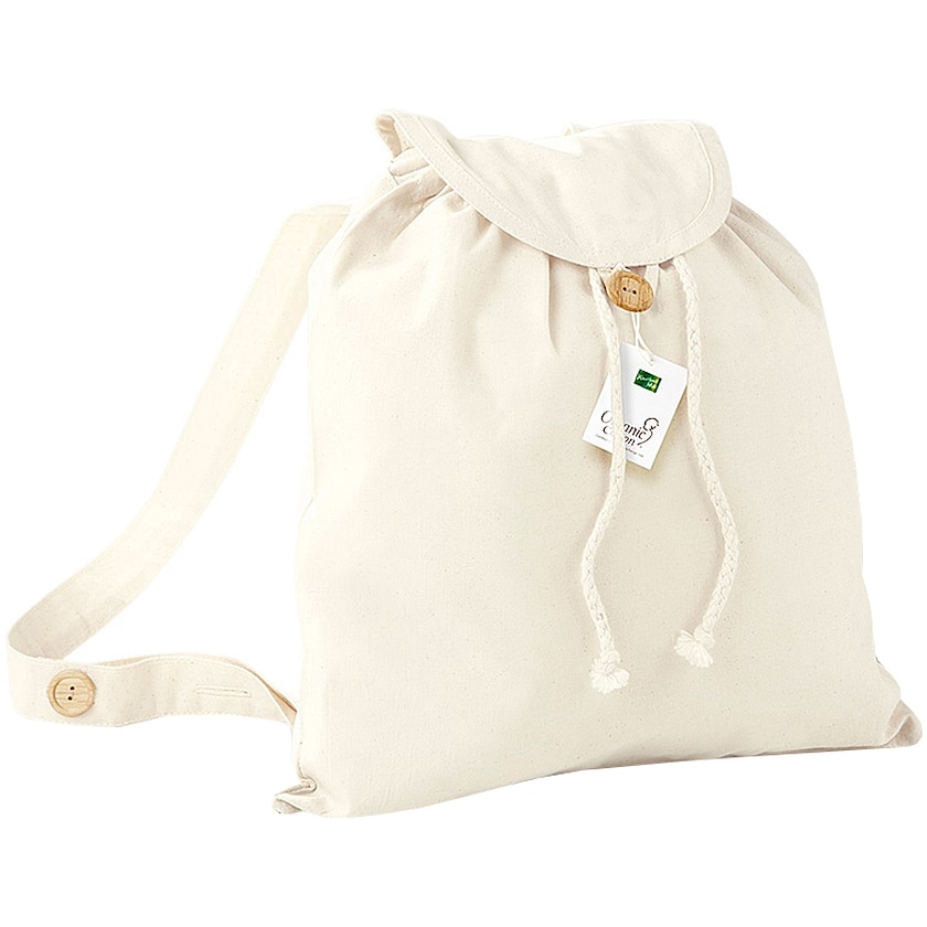 Luonnollisuus on kaunista - kuten tämä luonnonmukaisesta puuvillasta valmistettu reppu, jonka napit ovat puuta. Olkahihnat ovat säädettävät.