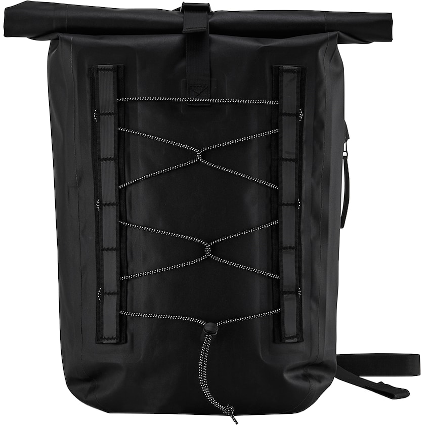 Ylellinen roll-top-reppu vedenpitävästä kankaasta. Repun sisässä on pehmustettu 13,5 tuuman läppärilokero. Edessä heijastavia yksityiskohtia. Toisella sivulla on vetoketjutasku.