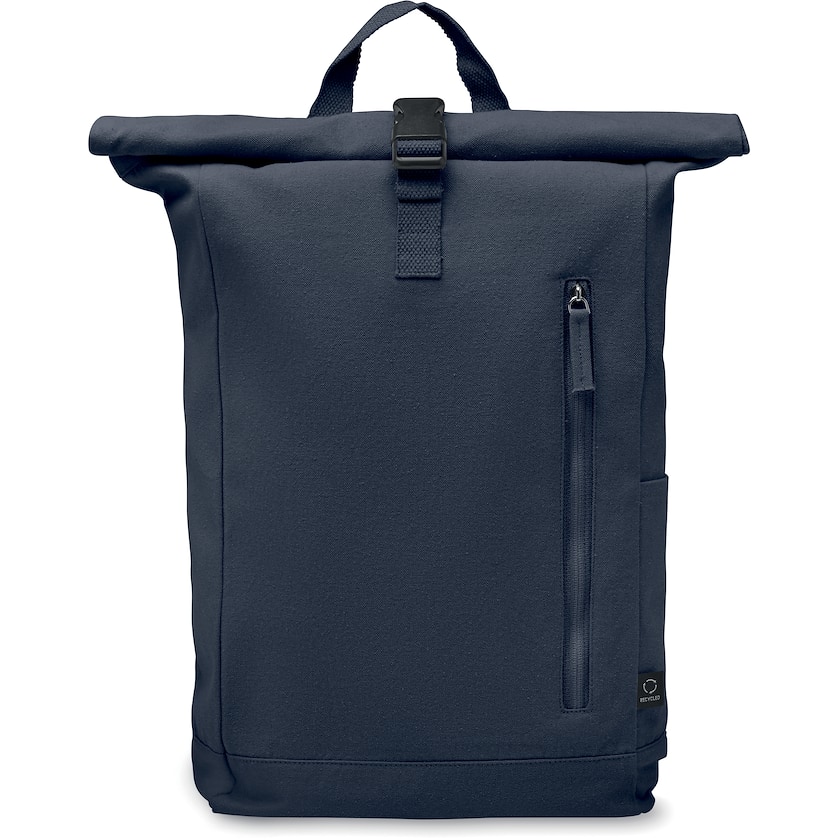 Ympäristöystävällinen roll-top-reppu kestävästä puuvillasekoitteesta. Kangas on valmistettu 80 % puuvillasta ja 20 % kierrätetystä polyesterista. Edessä on vetoketjullinen tasku. Toisella puolella on pienempi tasku.