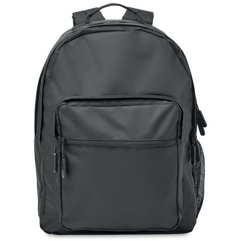 Tietokonereppu painatuksella kierrätetystä RPET-kankaasta. Sisällä on pehmustettu lokero 15 tuuman kannettavalle tietokoneelle. Repussa on kaksi suurta vetoketjullista lokeroa, kaksinkertaiset säilytystaskut edessä ja verkkotasku toisella sivulla. Selkä- ja olkahihnat ovat pehmustetut.