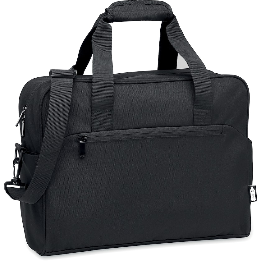 Ympäristöystävällinen tietokonelaukku 15 tuuman kannettavalle tietokoneelle. Etupuolella vetoketjutasku ja takapuolella remmi, jolla laukun saa kiinni matkalaukun kahvaan.