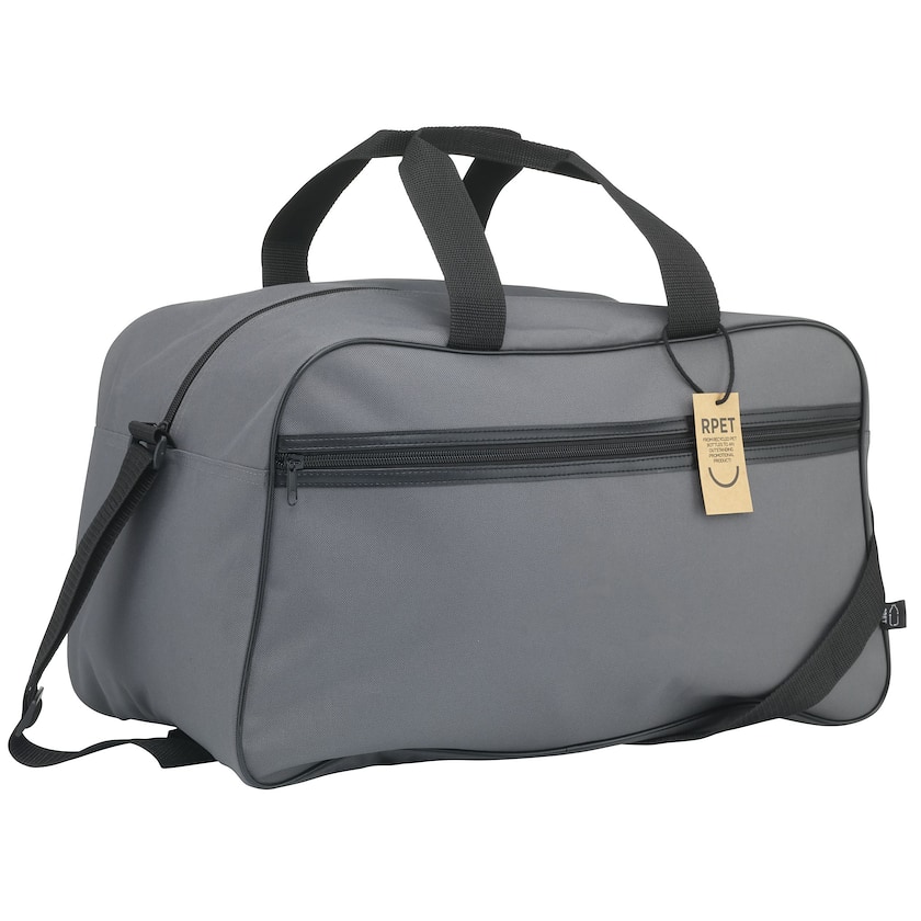 Kierrätetystä materiaalista valmistettu tilava treenilaukku. Laukku on valmistettu rPET:stä eli kierrätetyistä PET-pulloista. Edessä pienempi vetoketjullinen tasku. Vain 1-väripainatus on mahdollinen.