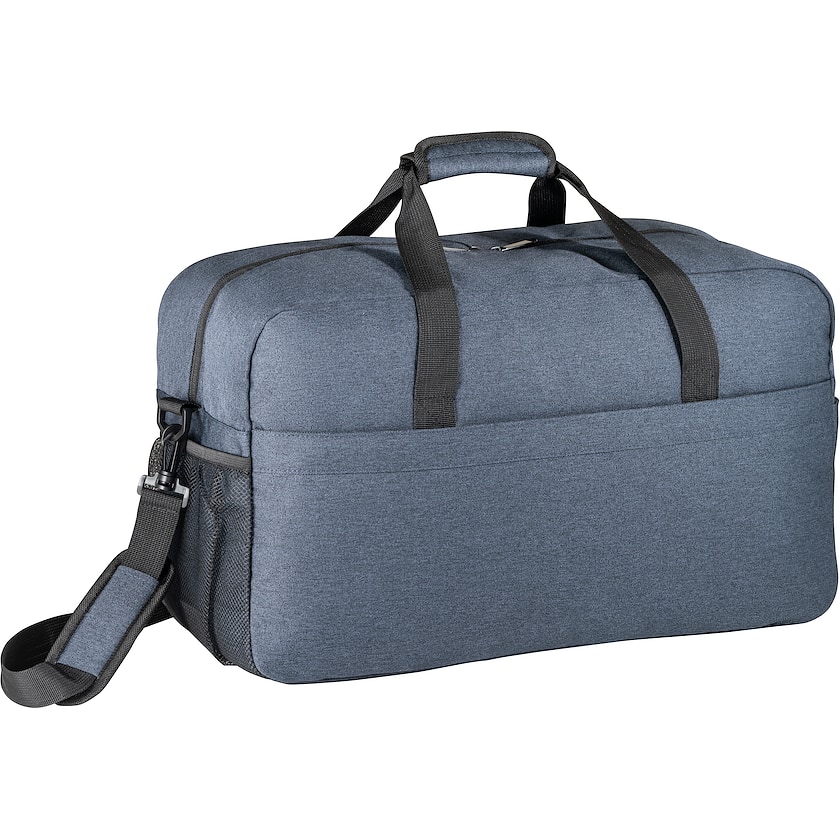Ympäristöystävällinen urheilulaukku rPETistä. Laukussa on vetoketjullisia sivutaskuja sekä verkkotasku. Materiaalina rPET, joka tuotetaan kierrätetyistä PET-pulloista.