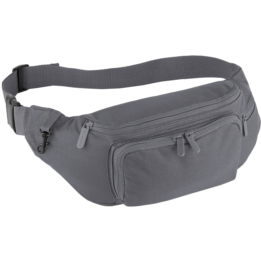Säädettävällä hihnalla varustettu korkealaatuinen vyötärölaukku. Laukussa on monia vetoketjullisia taskuja ja 2 litran tilavuus