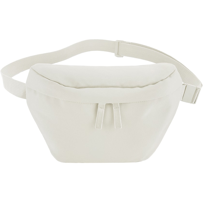 Ympäristöystävällinen vyölaukku kierrätetystä polyesteristä. Laukun takapuolella on vetoketjutasku. Kangas on vettähylkivää.