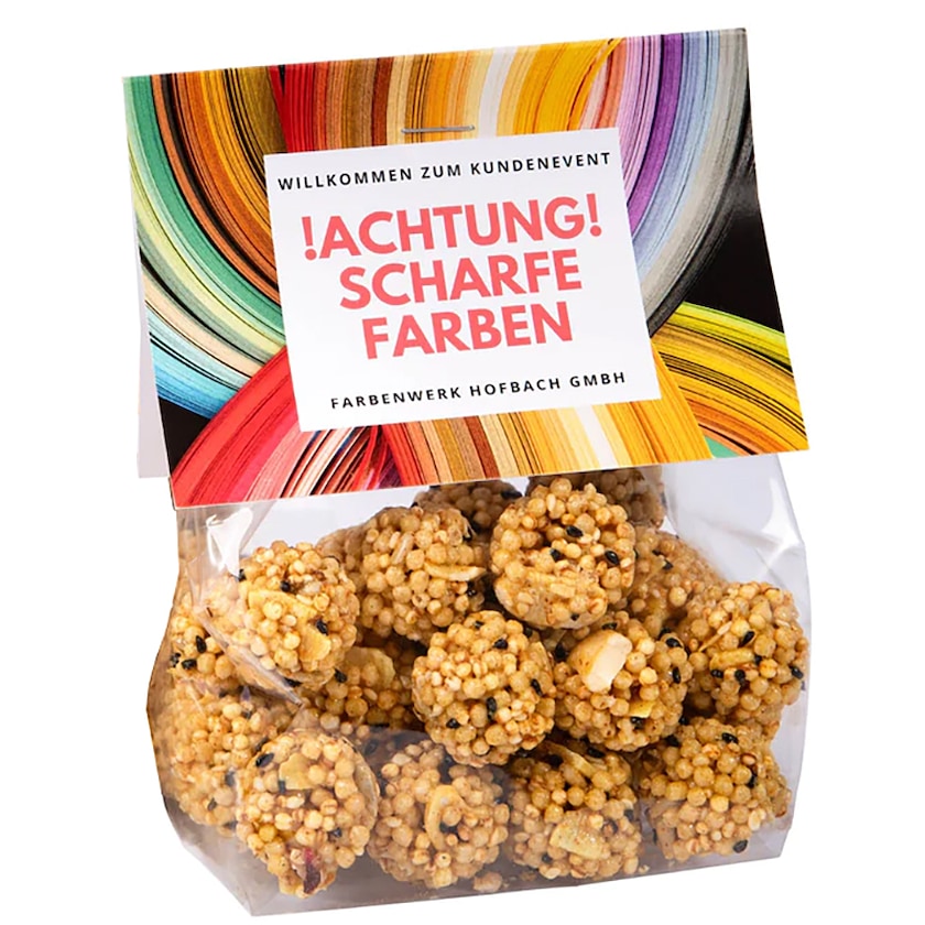 Iso pussi myslipalloja. Painatus tehdään pussin yläosan korttiin. Myslipallot on tehty quinoasta, kookoksesta, seesaminsiemenistä ja auringonkukan siemenistä, ja ne on maustettu currylla ja ripauksella chiliä. Terveellinen vaihtoehto sipseille.