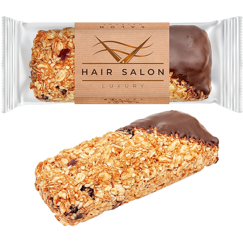 Osittain suklaaseen kastettu myslipatukka. Toimitetaan läpinäkyvässä pakkauksessa, jossa on ympärillä paperikääre omalla painatuksellasi.