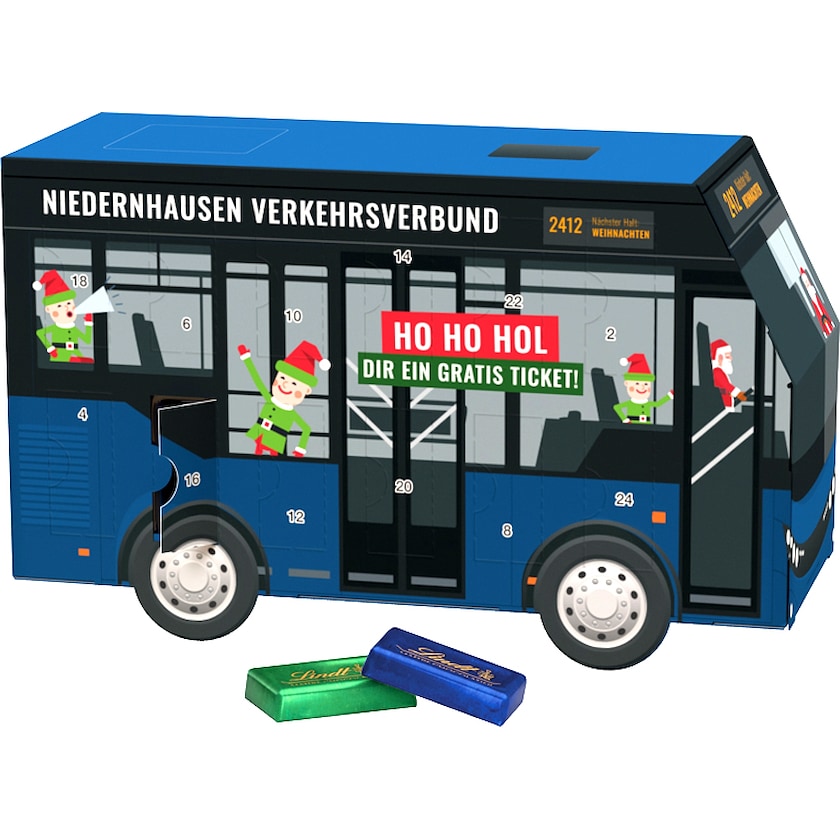 Ainutlaatuinen joulukalenteri, täytetty Lindtin suklaalla. Suklaapalat ovat maitosuklaata ja tulevat kolmessa eri foliovärissä. Kaikkien bussikuskien suosikki.