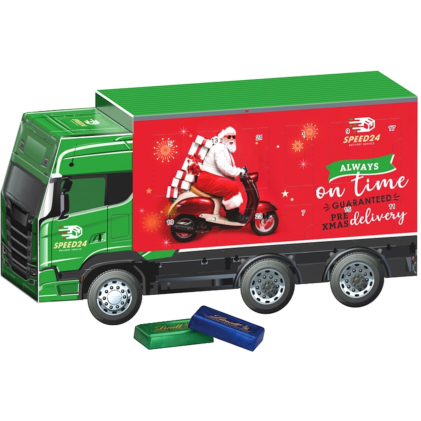 Rekka täynnä Lindtin maitosuklaata. Ainutlaatuinen joulukalenteri, joka erottuu joukosta. Täydellinen kuljetusyrityksille ja kuljetusliikkeille. Joulukalenteri on täytetty Lindtin maitosuklaalla kolmessa eri foliovärissä.