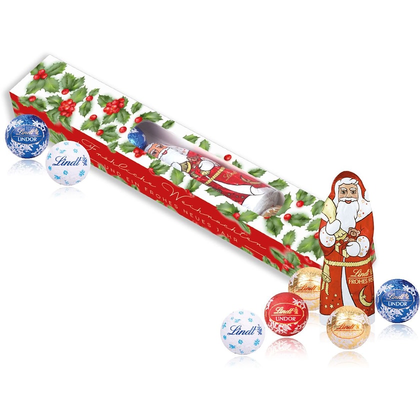 Lahjapakkaus, joka sisältää konvehteja ja suklaapukin. Lindt Christmas Parade sisältää 5 Lindt Miniä (n. 22 g) ja yhden Lindt-suklaapukin (n. 10 g). Kartonkipakkauksen ulkonäön voi suunnitella itse.
