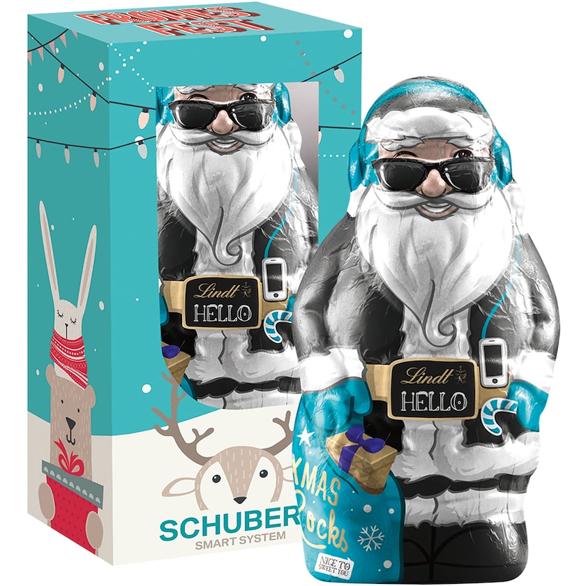 Trendikäs suklaapukki Lindt Hello -suklaasta. Ensiluokkaisesta maitosuklaasta tehty joulupukki on pakattu paperipakkaukseen, johon saa oman painatuksen. Tilaus sisältää suklaapukkeja sekä sinisissä että punaisissa foliokääreissä.