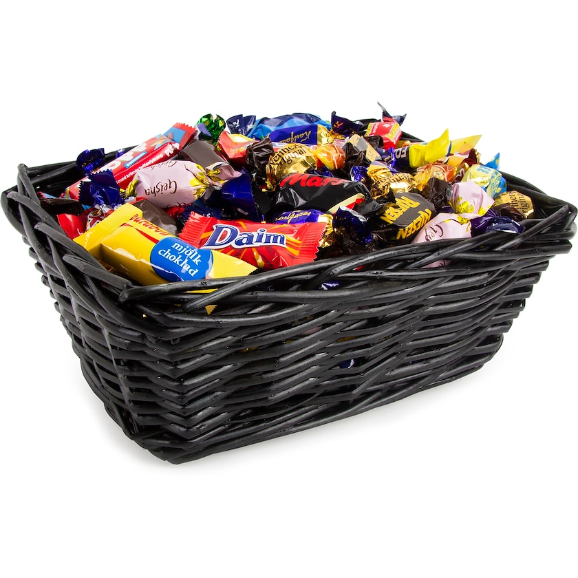 Musta kori, joka on täynnä laadukkaita makeisia. Sisältää klassikoita, kuten Toblerone, Dumle, Geisha ja Daim. Halutessasi koriin voi laittaa jouluaiheisen onnittelukortin.