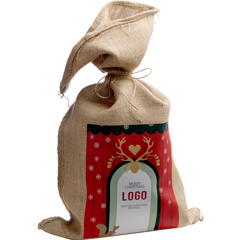 Suuri joulusäkki juutista täytetty valitsemallasi joulukarkeilla. Joulusäkkiin tehdään sinun painatus. Valitse italialaisen konvehtisekoituksen, suklaakuorrutetun toffeesekoituksen, jouluvaahtokarkkien tai joulutoffee sekoituksen välillä.