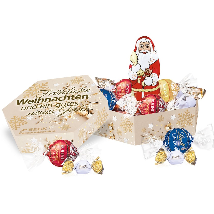 Suklaarasia, joka sisältää ylellisiä Lindt-suklaita. Lindt Christmas Maxi Box sisältää 5 Lindt Lindor-konvehtia, 5 Lindt-maitosuklaakonvehtia sekä 40 gramman suklaapukin. Upea joulutervehdys tärkeimmille asiakkaillesi. Koko rasia painetaan toiveidesi mukaisesti.