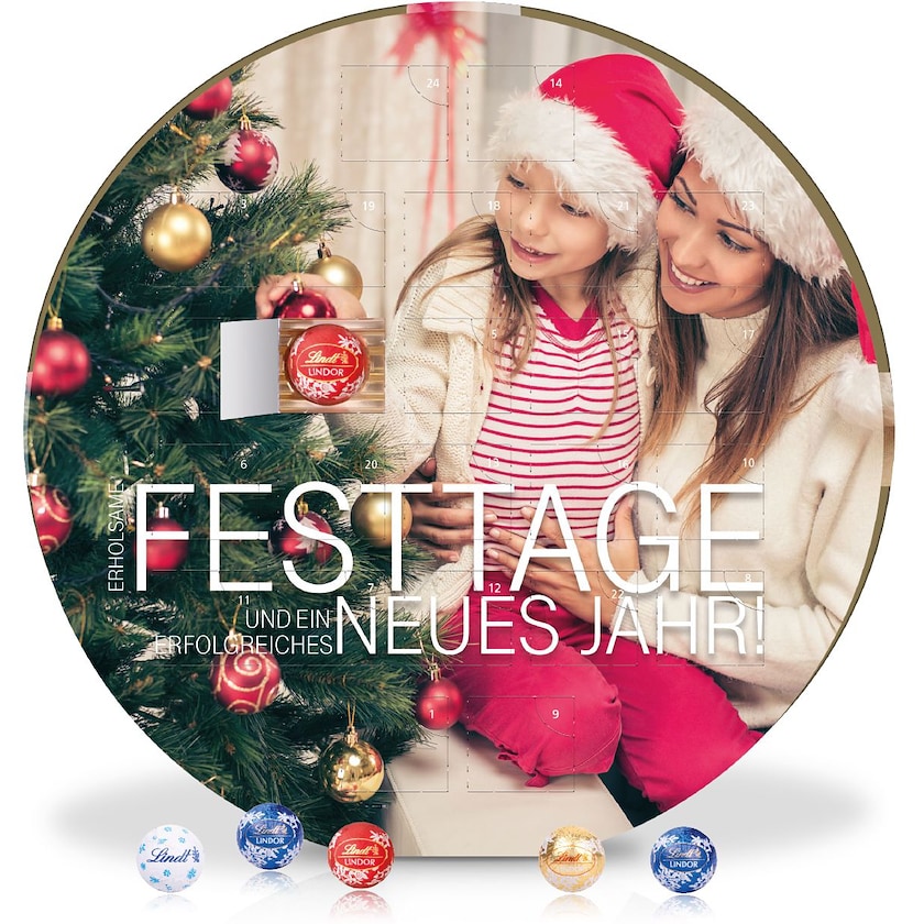 Pyöreä adventtikalenteri, jonka sisältönä on 24 kpl Lindt Mini -suklaita. Kalenteri on valmistettu FSC-merkitystä kartongista ja täysin ilmastoneutraalisti. Lataa painomalli, ja suunnittele yrityksellesi joulukalenteri omalla kuvalla.