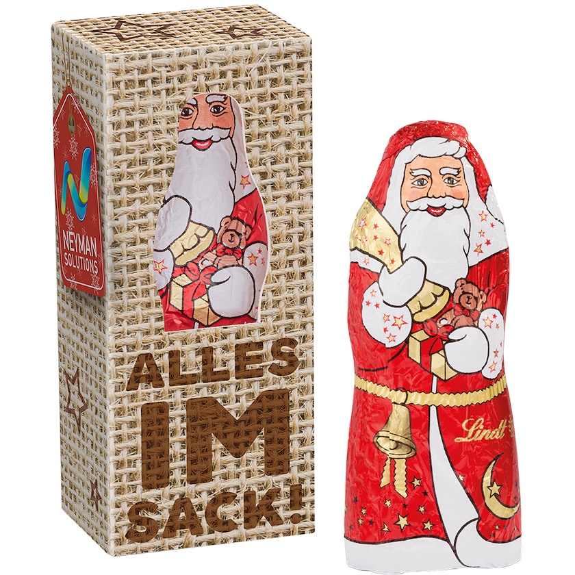 10 g Lindt Santa Claus kustomoitavassa pahvipakkauksessa. Koko pakkaus ulkonäön voi suunnitella itse. Lataa alta painomalli ja luo persoonallinen pakkaus suklaapukille. Pukki on valmistettu ensiluokkaisesta Lindt-maitosuklaasta.