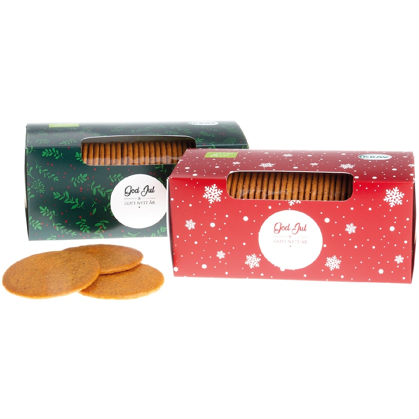 Ekologisia piparkakkuja pahvissa omalla painatuksella. Piparkakut tulevat Nyåkersilta ja ovat leivottu vuoden 1952 alkuperäisreseptin mukaan. Koko piparkakkupahvi painatetaan toiveidesi mukaan.