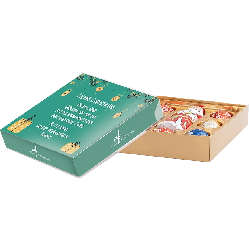 Suklaarasia, joka sisältää ylellisiä Lindt-joulusuklaita. Lindt Xmas-rasiassa on 5 Lindor-kuulaa ja yksi suklaapukki. Koko kannen alalle saa oman painatuksen.