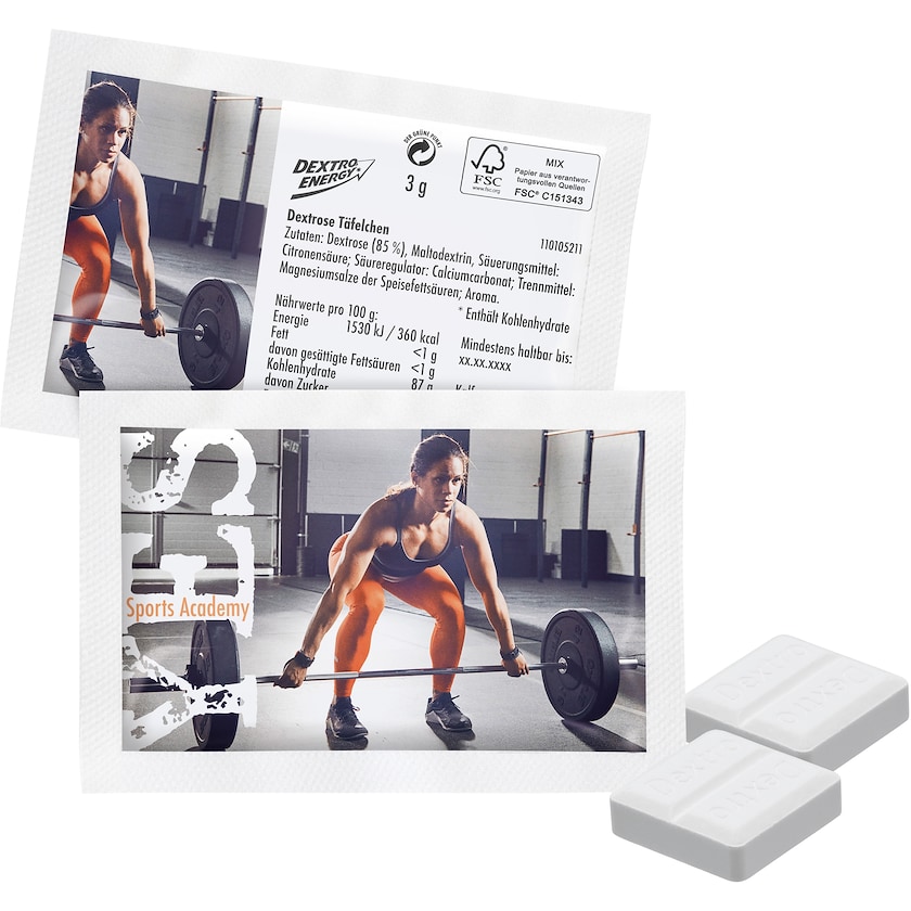 Kahden Dextro Energy -tabletin pakkaus. Koko pakkauksen alalle saa oman painatuksen. Pieni pakkaus täynnä energiaa!