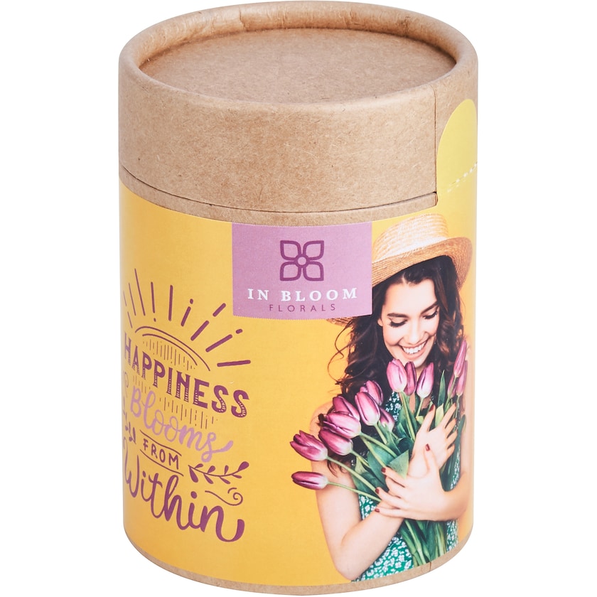 200 grammaa karamelleja ekologisessa paperipurkissa. Pakkauksen etikettiin tehdään digipainatus, jonka voit suunnitella kokonaan itse. Pakkaus on biohajoava.