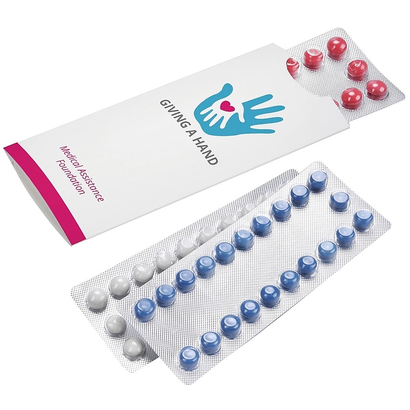 21 pastillia läpipainopakkauksessa, jolla on paperinen suojakotelo. Koko paperipakkaus painatetaan digipainatuksella. Karkkeihin valittavana eri makuja.