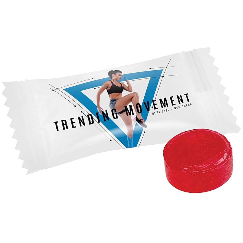 Pyöreä sokeriton karamelli flowpack-kääreessä. Isomaltilla makeutetut karkit ovat n. 4 gramman painoisia, ja ne on pakattu kääreeseen, jonka voit suunnitella itse.