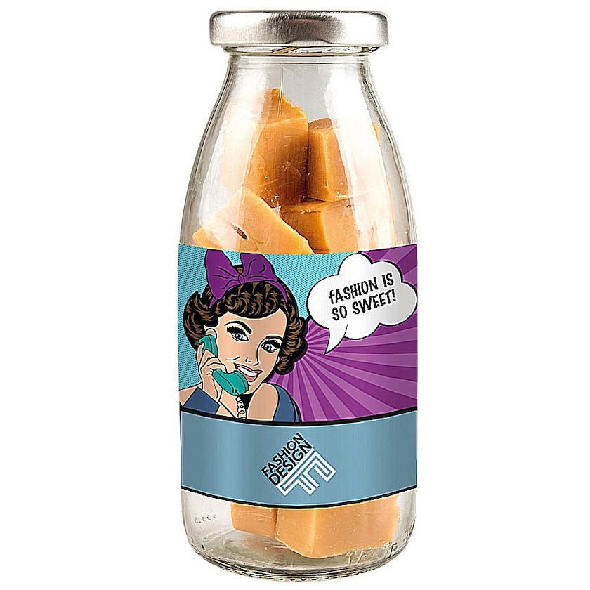 Lasipullo, jossa sisällä 140 grammaa herkullista pehmeää toffeeta. Etiketti painatetaan digipainatuksella ja suunnitellaan täysin toiveidesi mukaan. Hauska ja erilainen vaihtoehto suklaarasialle!