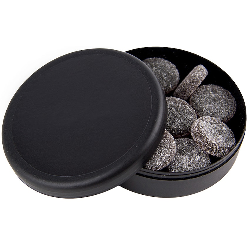 Makeisia kiekossa! Jännä makeispurkki kiekon muodossa. Musta tai punainen kiekko. Painatus digipainatuksella kannen tarraan.