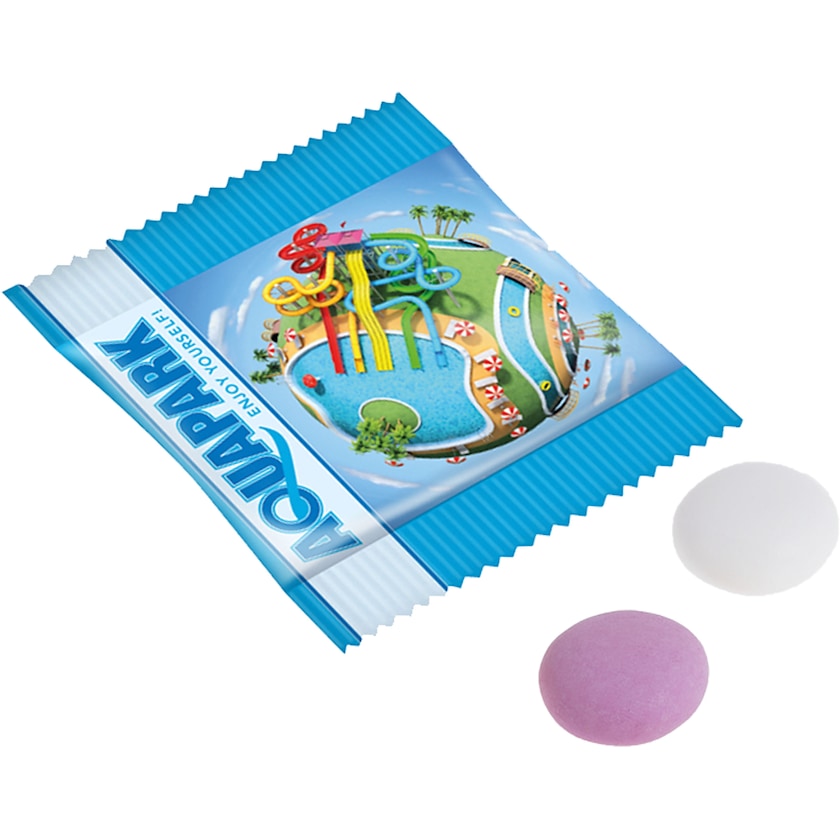 Kaksi Mentos-karkkia kustomoitavassa pakkauksessa. Koko flowpack-pakkaus painetaan toiveidesi mukaisesti. Karkit saa joko mintun makuisina tai hedelmäsekoituksena.