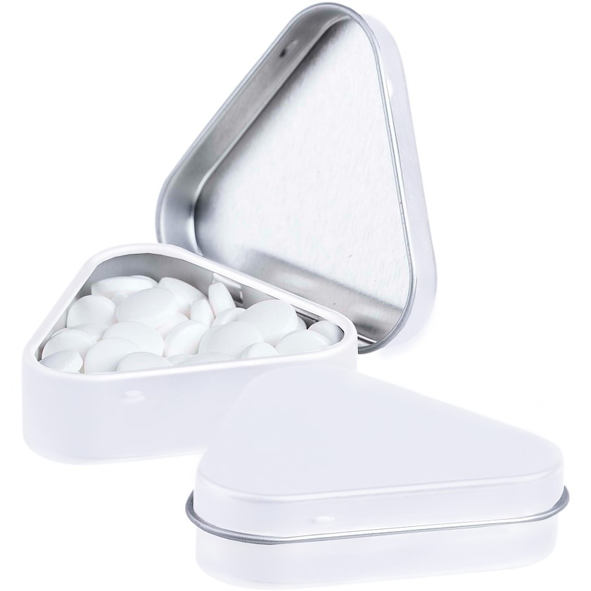 Kolmionmuotoinen metallirasia, joka sisältää minttupastilleja. Valittavana tavalliset tai sokerittomat minttupastillit.