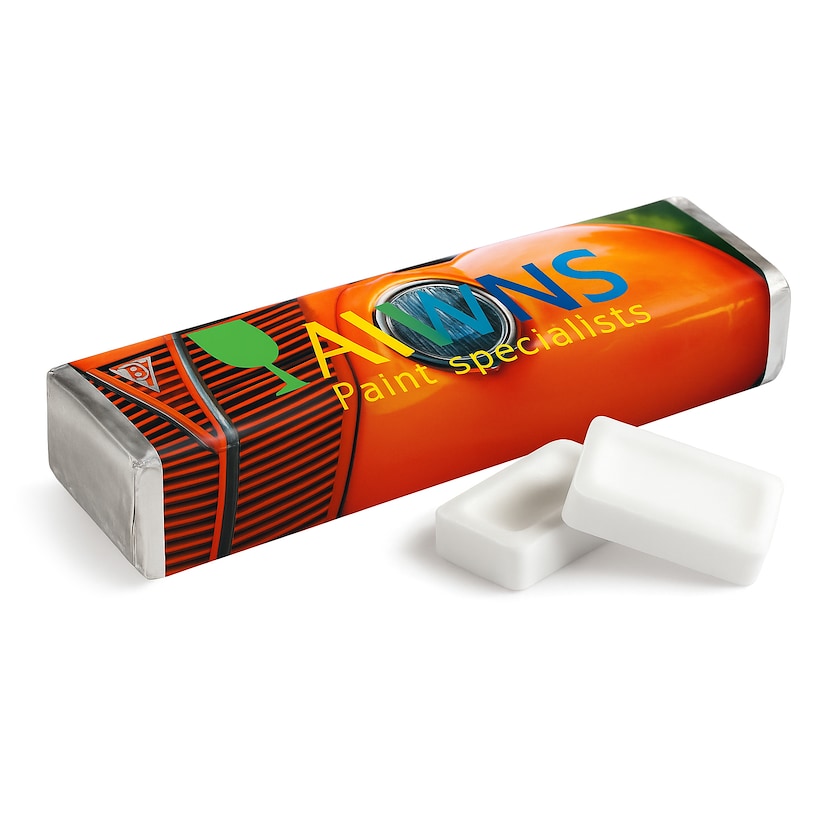 Edulliset minttupastillit foliokääreissä. Painatus tehdään pakkauksen paperietikettiin. Minttupastillit ovat sokerittomia.