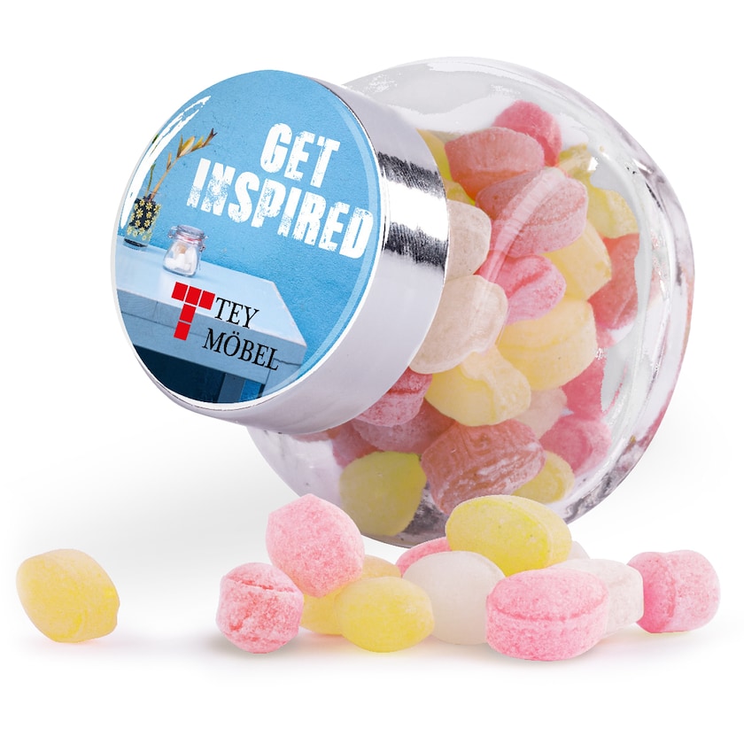 Pieni karkkipurkki, joka tekee vaikutuksen! Purkin kanteen saa oman digipainatuksen doming-etikettiin. Purkki sisältää karkkisekoituksen, joka on valmistettu Saksassa.