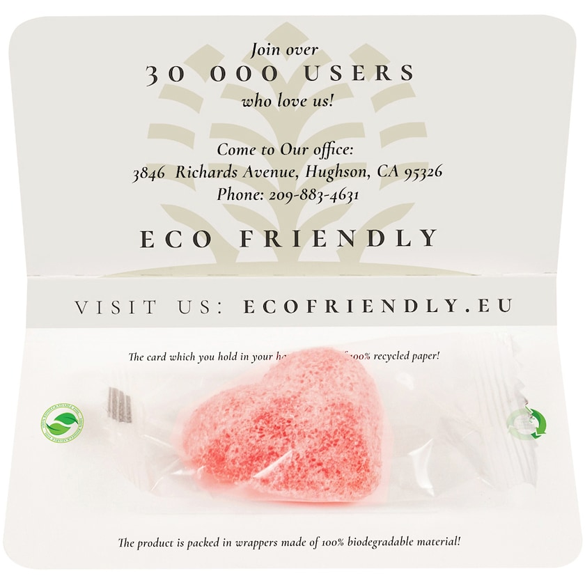 Pehmeä mansikan makuinen sydänkarkki biohajoavassa pakkauksessa. Pahvikortti on rei'itetty, eli siihen voi painattaa esimerkiksi irti repäistävän alennuskupongin.