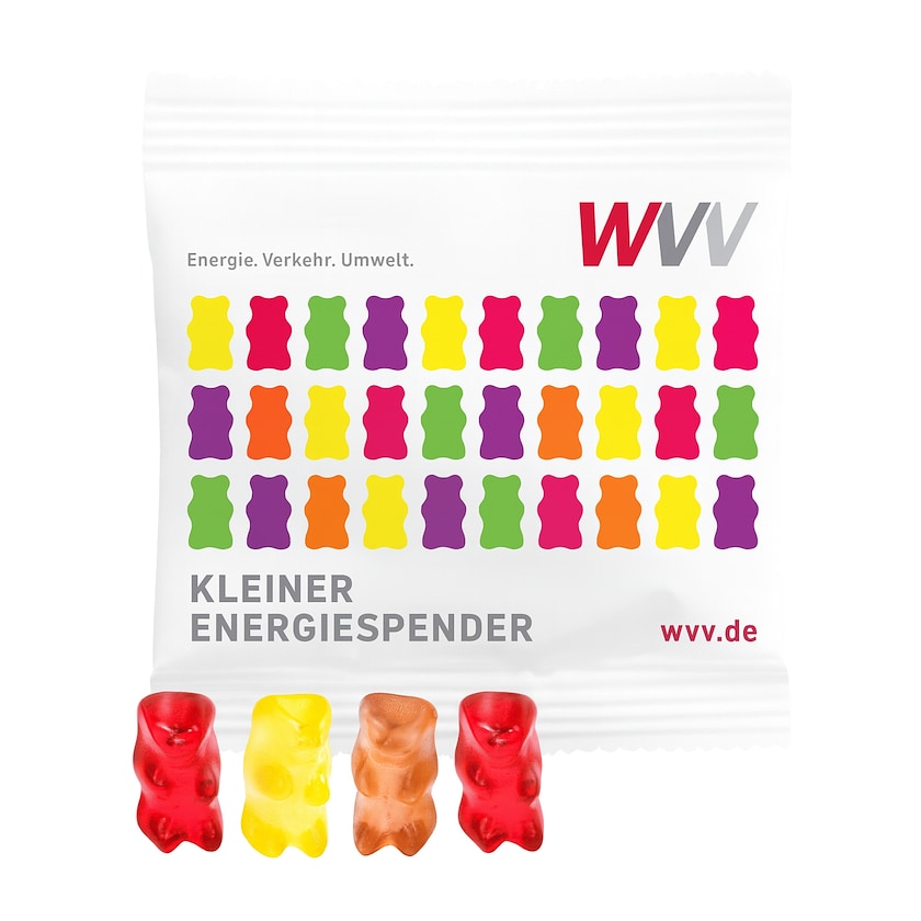 10 gramman pussi nallekarkkeja, minimitilausmäärä 1000 kpl. Nallekarkeilla on herkullinen hedelmäinen maku. Pussiin tehdään digipainatus täysin toiveidesi mukaan. Pakkauksen materiaalina on valkoinen muovi. Täydellinen valinta messuille, tapahtumiin tai näyttelyihin!