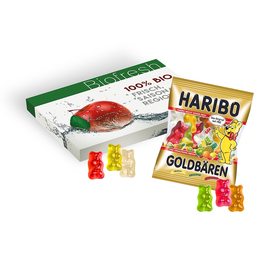 Paperipakkaus, joka sisältää pienen Haribo-karkkipussin. Koko kartonki painetaan toiveidesi mukaisesti. Saatavilla kolme eri karkkivaihtoehtoa.