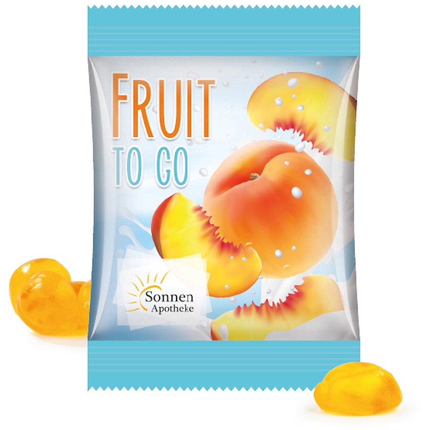 Vitaminoidut aprikoosikarkit kustomoitavassa pussissa. Maukkaissa karkeissa on hedelmäpaloja ja niihin on lisätty multivitamiineja. Koko pakkauksen ulkonäön voi suunnitella itse.