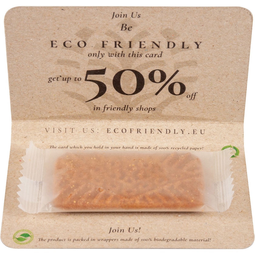 Herkullinen karamellinmakuinen keksi ruskeassa pahvikortissa. Keksin käärepaperi on biohajoavaa materiaalia. Paperikortissa on rei'itys, jotta sen toisen puolen voi repäistä irti ja käyttää esimerkiksi alennuskuponkina tai käyntikorttina.